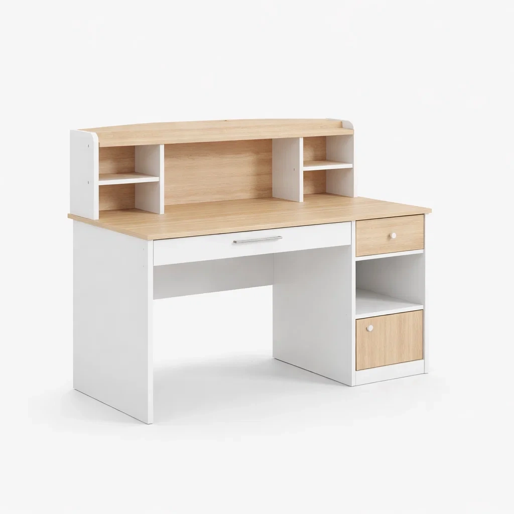 Bureau en bois aggloméré avec étagère et tiroirs blanc chêne clair