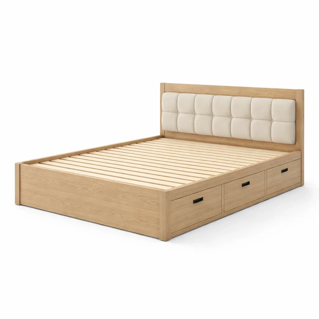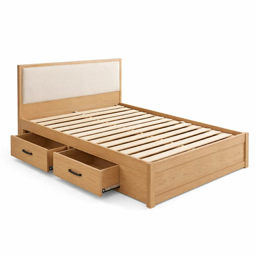 Lit avec rangement double en chêne avec tête de lit rembourrée et tiroirs