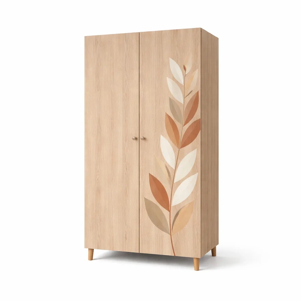 Elle est ornée d'un motif de feuilles multicolores et dispose de 2 portes battantes. À l'intérieur, les étagères sont réglables pour un rangement personnalisé. Les poignées et les pieds sont également en bois, garantissant ainsi une uniformité de matériau.