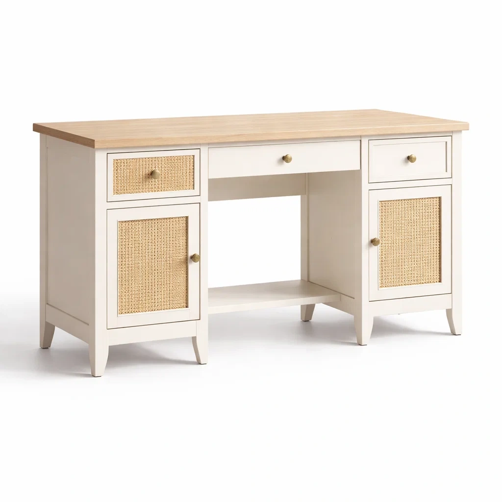Matériau : Structure en MDF, surface en chêne massif, panneaux de portes et tiroirs en rotin naturel.