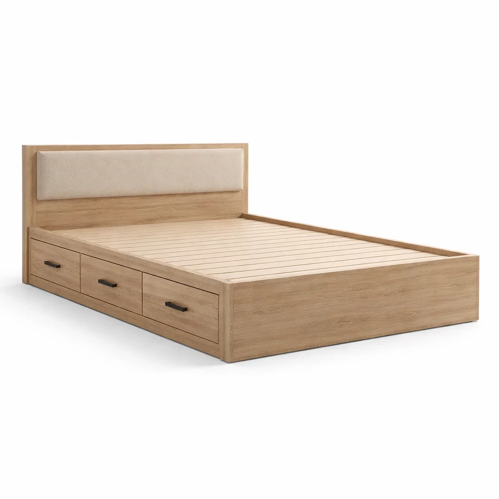 Matériau : Structure en bois de chêne, tête de lit rembourrée avec tissu en polyester.